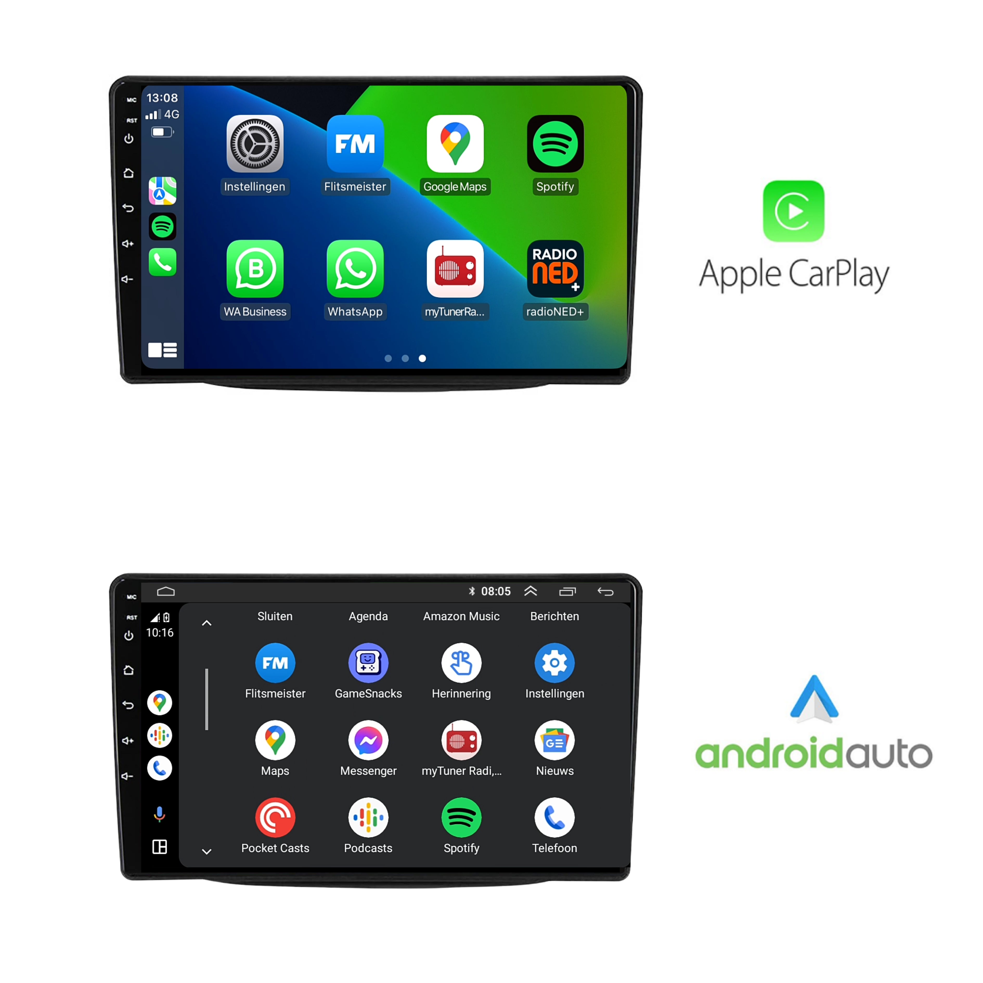 - Draadloos CarPlay & Android Auto: Bedien je smartphone via het radioscherm