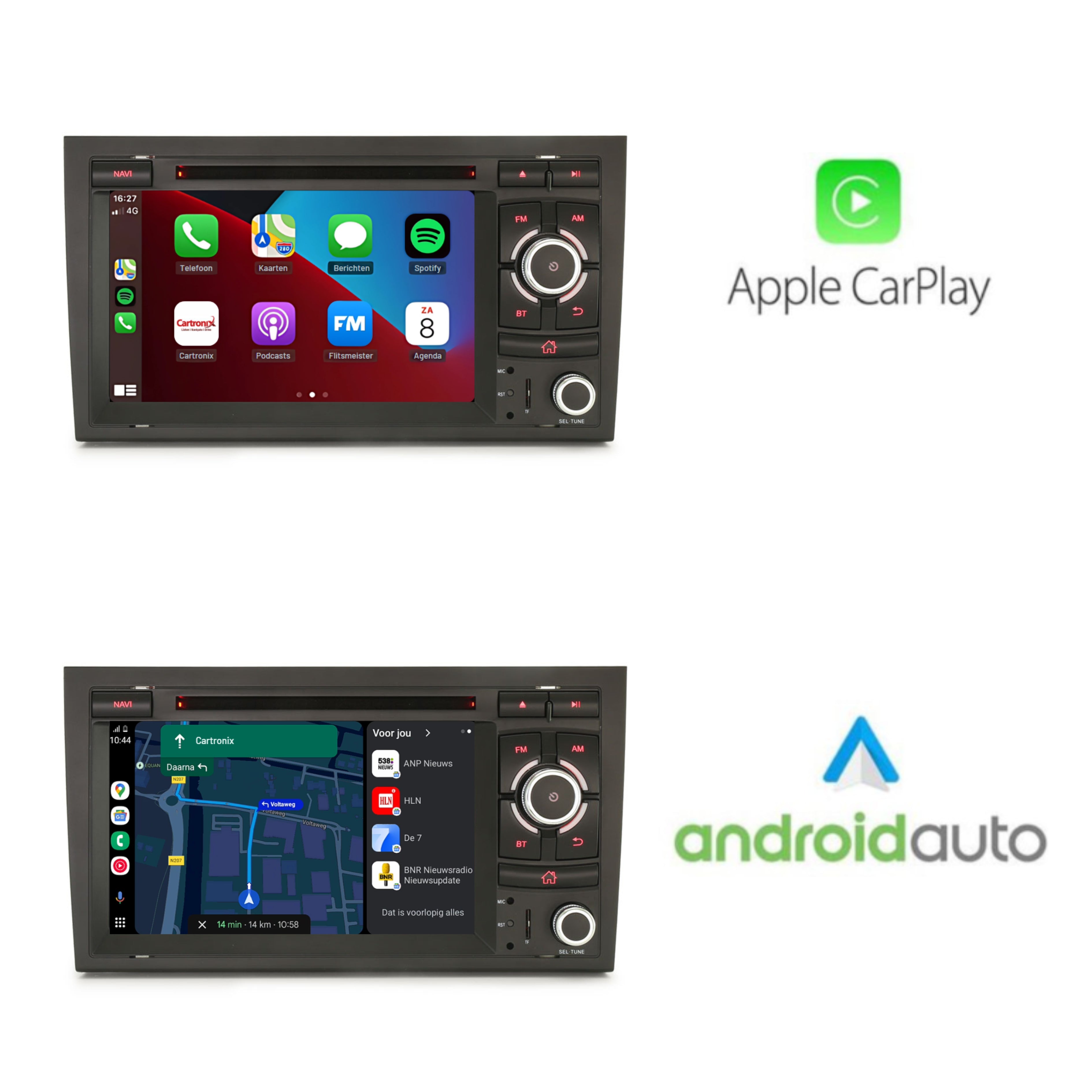 Met de Cartronix CTX-116728 geniet je van de nieuwste draadloze CarPlay en Android Auto functies. Koppel eenvoudig je iPhone of Android-smartphone en bedien onderweg alles veilig via het touchscreen. Navigeer met Google Maps of Apple Kaarten, bel handsfree, luister naar Spotify of podcasts, en gebruik spraakopdrachten via Siri of Google Assistent; allemaal zonder je telefoon vast te houden.