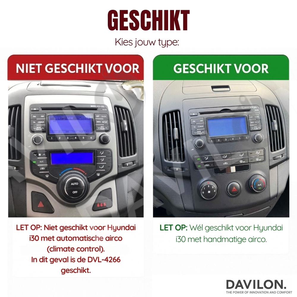 Dit artikel past enkel in de Hyundai i30 met handmatige airconditioning. Beschik je over een Hyundai i30 met automatische airconditioning? Dan is de DVL-4227 een geschikt alternatief.